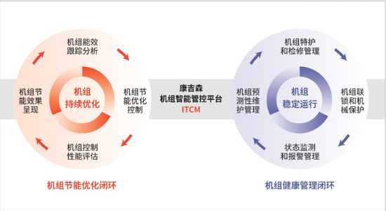 康吉森機組優(yōu)化改造解決方案。通過ITCM平臺對機組運行狀況、工藝參數、機械狀態(tài)、控制參數的綜合計算和智能分析,結合機組控制算法實現壓縮機組憂化控制、節(jié)能降耗和智能控制。